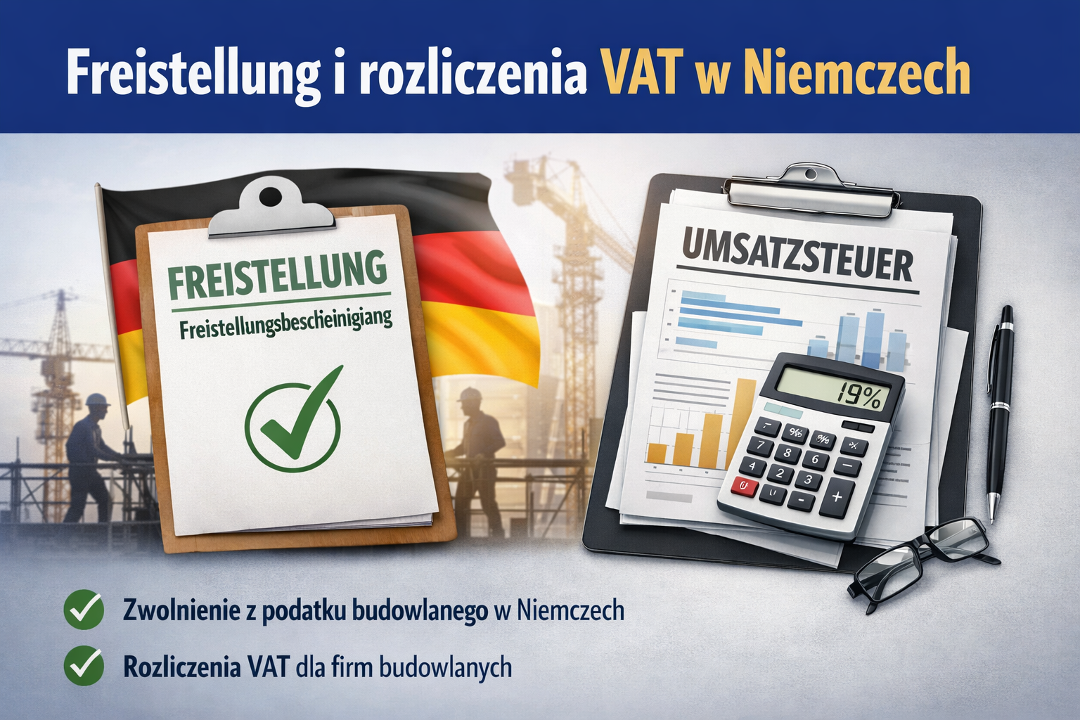 Pomagamy firmom z branży budowlanej działającym na terenie Niemiec w uzyskaniu zwolnienia z podatku budowlanego (Freistellung). Dokument ten pozwala uniknąć potrącania podatku od wynagrodzenia za wykonane usługi budowlane i jest niezbędny dla wielu firm realizujących zlecenia w Niemczech.